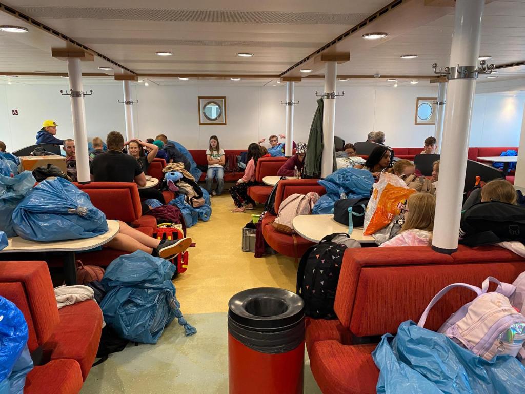 Nun sind die letzten Stunden auf der Insel vorbei. Nach einem letzten Aufräumen sind wir nun auf dem Weg zur Fähre. Trotz des schlechten Wetters herrscht gute Stimmung.
