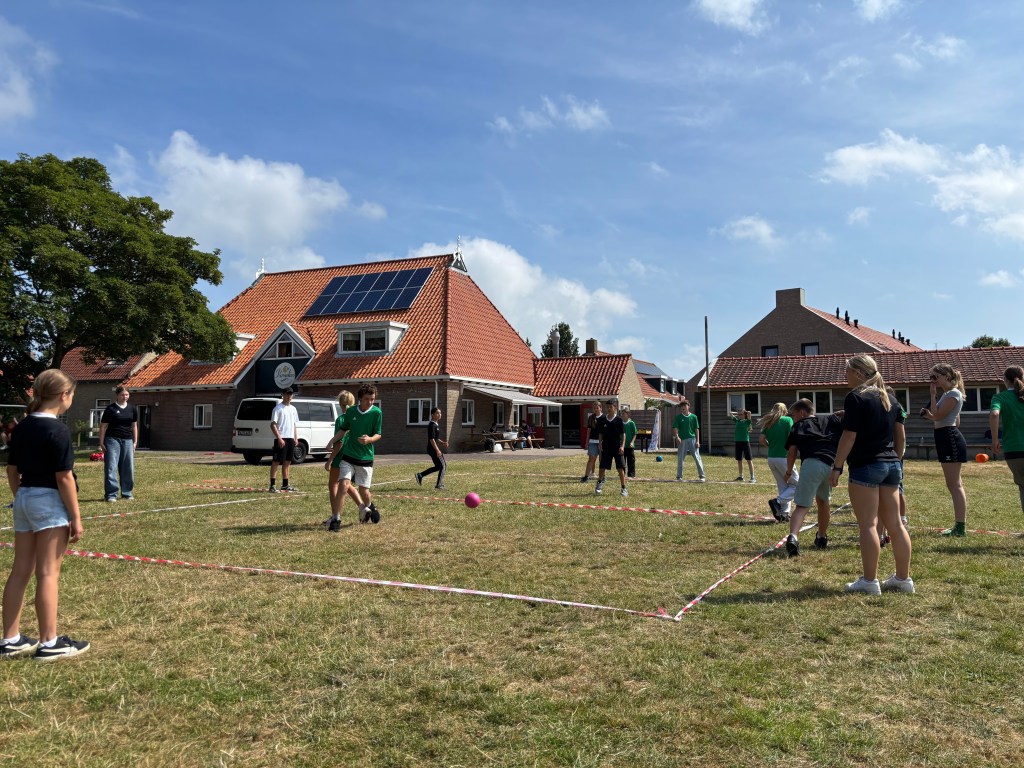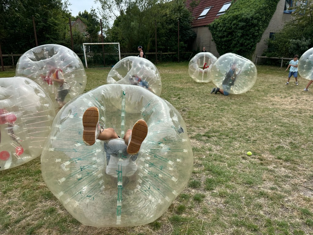 Nach der Mittagspause gab es wieder einmal das Wahlprogramm. Man traute seinen Augen kaum, als plötzlich riesige Bälle auf der Wiese auftauchten, in die man sich reinstellen und so herumrollen und hüpfen konnte. Die Lagerzeitung wurde fleißig von den Reportern gedruckt und im Speisesaal wurden im Akkord Armbänder und Ketten gefertigt. Als zusätzliche Entspannung gab es mit beruhigender Musik eine Yogastunde und die aktiven Kinder verausgabten sich beim Volleyball. Die Sonne stand hoch am Himmel, als es einen riesen Haufen Wassereis und Kuchen regnete. Niemand kann also sagen, dass man hier verhungert.